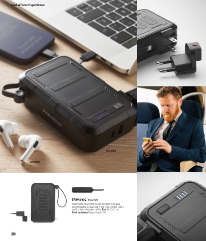 03MO2737MO2709Powroc MO2709Power bank 20000 mAh in ABS with built-in US plug and removable AC plug. USB A and type-C in/out. Type-C and 2 in 1 pin integrated cables. Size 11,6x7,1x3,1 cm Print technique Pad printing,DL,DO118End of Year Experience