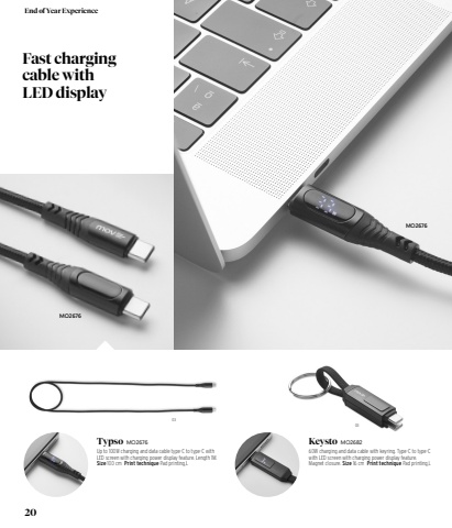 0303MO2676MO2676Typso MO2676Up to 100W charging and data cable type-C to type-C with LED screen with charging power display feature. Length 1M. Size 100 cm Print technique Pad printing,LKeysto MO268260W charging and data cable with keyring. Type-C to type-C with LED screen with charging power display feature. Magnet closure. Size 16 cm Print technique Pad printing,LFast charging cable with LED display20End of Year Experience