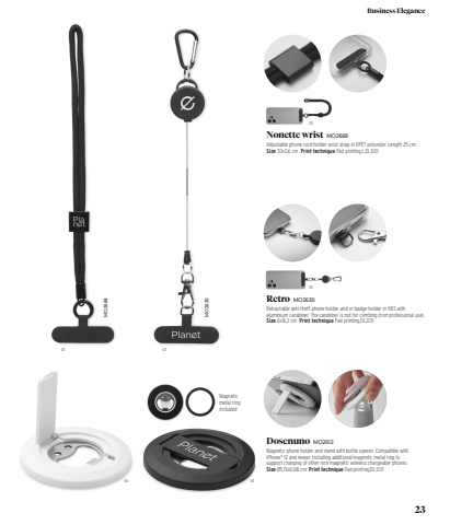 0306 03030303MO2668 MO2630Nonette wrist MO2668Adjustable phone cord holder wrist strap in RPET polyester. Length 25 cm. Size 30x0,6 cm Print technique Pad printing,L,DL,DO1Dosenuno MO2612Magnetic phone holder and stand with bottle opener. Compatible with iPhone%u00ae 12 and newer. Including additional magnetic metal ring to support charging of other non-magnetic wireless chargeable phones. Size %u00d85,76x0,68 cm Print technique Pad printing,DL,DO1Retro MO2630Retractable anti-theft phone holder and or badge holder in ABS with aluminium carabiner. The carabiner is not for climbing (non-professional use).Size 6x16,2 cm Print technique Pad printing,DL,DO1Magnetic metal ring included23Business Elegance