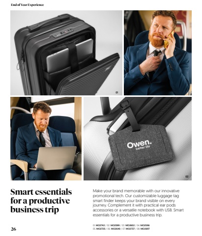 0102Make your brand memorable with our innovative promotional tech. Our customizable luggage tag smart finder keeps your brand visible on every journey. Complement it with practical ear pods accessories or a versatile notebook with USB. Smart essentials for a productive business trip.Smart essentials for a productive business trip01. MO2742 / 02. MO2599 / 03. MO2602 / 04. MO2596 26 05. MO2725 / 06. MO2640 / 07. MO2737 / 08. MO2697End of Year Experience