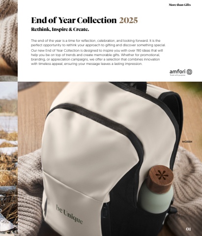 End of Year Collection 2025MO2684The end of the year is a time for reflection, celebration, and looking forward. It is the perfect opportunity to rethink your approach to gifting and discover something special.Our new End of Year Collection is designed to inspire you with over 190 ideas that will help you be on top of trends and create memorable gifts. Whether for promotional, branding, or appreciation campaigns, we offer a selection that combines innovation with timeless appeal, ensuring your message leaves a lasting impression.Rethink, Inspire & Create.More than Gifts01