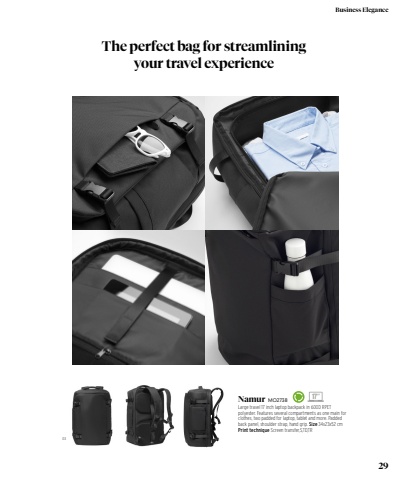 0317%u201d Namur MO2738Large travel 17 inch laptop backpack in 600D RPET polyester. Features several compartments as one main for clothes, two padded for laptop, tablet and more. Padded back panel, shoulder strap, hand grip. Size 34x23x52 cm Print technique Screen transfer,S,TD,TRThe perfect bag for streamlining your travel experience29Business Elegance