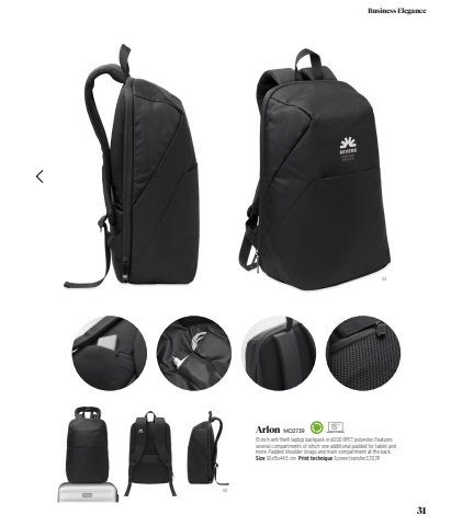 030315%u201d Arlon MO273915 inch anti-theft laptop backpack in 600D RPET polyester. Features several compartments of which one additional padded for tablet and more. Padded shoulder straps and main compartment at the back. Size 30x15x44,5 cm Print technique Screen transfer,S,TD,TR31Business Elegance