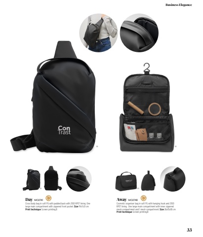 0303 0303Day MO2741Cross body bag in soft PU with padded back with 210D RPET lining. One large main compartment with zippered front pocket. Size 19x7x31 cm Print technique Screen printing,BAway MO2740Cosmetic organiser bag in soft PU with hanging hook and 210D RPET lining. One large main compartment with inner zippered mesh compartment and 1 mesh compartment. Size 26x15x18 cm Print technique Screen printing,B33Business Elegance