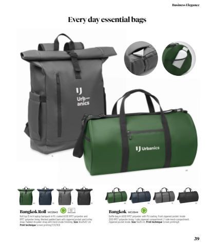60 04 15 03 60 04 15 03156015%u201d Bangkok MO2644Duffle bag in 600D RPET polyester with PU coating. Front zippered pocket. Inside 210D RPET polyester lining. 1 side zippered compartment / 1 side mesh compartment. Zippered pocket inside. Size 51x28 cm Print technique Screen printing,BBangkok Roll MO2643Roll top 15 inch laptop backpack in PU coated 600D RPET polyester and RPET polyester lining. Meshed padded back with zippered pocket and trolley strap. Padded shoulder strap with mesh inside finishing. Size 30x25x57 cm Print technique Screen printing,T1,TD,TR,BEvery day essential bags39Business Elegance