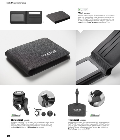 030303Tagsmart MO2599Luggage tag (70% PU and 30% recycled polyester) with rechargeable smart Apple%u00ae Find My locator anti-loss finder. Only compatible with Apple%u00ae devices (iOS). The Apple%u00ae Find My network is a safe and convenient way to find your compatible personal items using your Apple%u00ae devices. Size 9,7x7,7x0,5 cm Print technique Screen printing,T1,TD,TRRingsmart MO2601Bicycle bell smart Apple%u00ae Find My locator. Only compatible with Apple%u00ae devices (iOS). The Apple%u00ae Find My network is a safe and convenient way to find your compatible personal items using your Apple%u00ae devices. 1 CR2032 cell battery included. Size 3,8x5,5x6 cm Print technique Pad printing,LWall MO2697PU wallet with rechargeable smart Apple%u00ae Find My locator anti-loss finder. Only compatible with Apple%u00ae devices (iOS). Built-in 100 mAh battery. The Apple%u00ae Find My network is a safe and convenient way to find your compatible personal items using your Apple%u00ae devices. Size 9x11,7x1,5 cm Print technique Screen printing,T1,TD,TR40End of Year Experience
