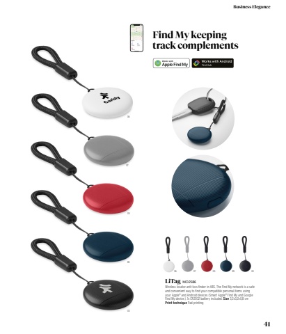 06 05 85 03060585030707LiTag MO2586Wireless locator anti-loss finder in ABS. The Find My network is a safe and convenient way to find your compatible personal items using your Apple%u00ae and Android devices (Smart Apple%u00ae Find My and Google Find My device.). 1x CR2032 battery included. Size 3,2x3,2x0,8 cm Print technique Pad printingFind My keeping track complements41Business Elegance