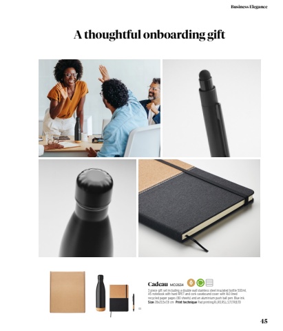 03A thoughtful onboarding giftCadeau MO26343 piece gift set including a double wall stainless steel insulated bottle 500ml, A5 notebook with hard RPET and cork casebound cover with 160 lined recycled paper pages (80 sheets) and an aluminium push ball pen. Blue ink. Size 28x23,5x7,8 cm Print technique Pad printing,RL,RD,RS,L,S,T1,TR,B,TD45Business Elegance