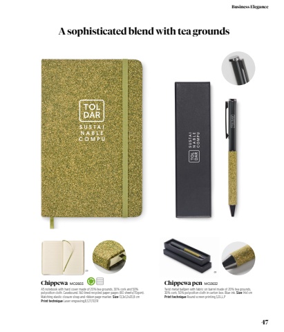 09 09A sophisticated blend with tea groundsChippewa pen MO2632Twist metal ballpen with fabric on barrel made of 20% tea grounds, 30% cork, 50% polycotton cloth in carton box. Blue ink. Size 14x1 cm Print technique Round screen printing,S,DL,L,PChippewa MO2603A5 notebook with hard cover made of 20% tea grounds, 30% cork and 50% polycotton cloth. Casebound. 160 lined recycled paper pages (80 sheets/70gsm). Matching elastic closure strap and ribbon page-marker. Size 13,3x1,2x20,8 cm Print technique Laser engraving,B,S,T1,TD,TR47Business Elegance