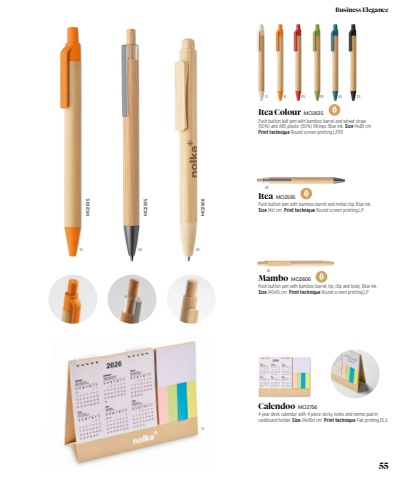 10 40 40134013 10 05 09 04 0340MO2635 MO2595 MO2606Itea Colour MO2635Push button ball pen with bamboo barrel and wheat straw (50%) and ABS plastic (50%) fittings. Blue ink. Size 14x%u00d81 cm Print technique Round screen printing,L,P,PDCalendoo MO27564 year desk calendar with 4-piece sticky notes and memo pad in cardboard holder. Size 24x18x1 cm Print technique Pad printing,DL,SItea MO2595Push button pen with bamboo barrel and metal clip. Blue ink. Size 14x1 cm Print technique Round screen printing,L,PMambo MO2606Push button pen with bamboo barrel, tip, clip and body. Blue ink. Size 140x10 cm Print technique Round screen printing,L,P55Business Elegance