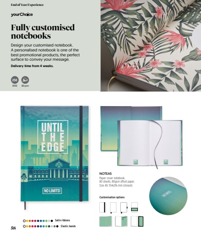 250MOQ 80 gsmElastic bandsSatin ribbonsFully customised notebooksDesign your customised notebook. A personalised notebook is one of the best promotional products, the perfect surface to convey your message.Delivery time from 4 weeks.NOTEA5 Paper cover notebook.80 sheets, 80gsm offset paper. Size A5: 154x216 mm (closed). Customisation options58End of Year Experience