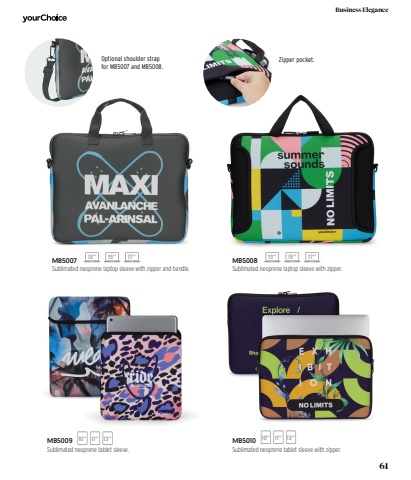 13%u201d 15%u201d 17%u201d 13%u201d 15%u201d 17%u201d10%u201d 11%u201d 13%u201d 10%u201d 11%u201d 13%u201dMB5007Sublimated neoprene laptop sleeve with zipper and handle.MB5008Sublimated neoprene laptop sleeve with zipper.Optional shoulder strap for MB5007 and MB5008.Zipper pocket.MB5009Sublimated neoprene tablet sleeve.MB5010Sublimated neoprene tablet sleeve with zipper.61Business Elegance