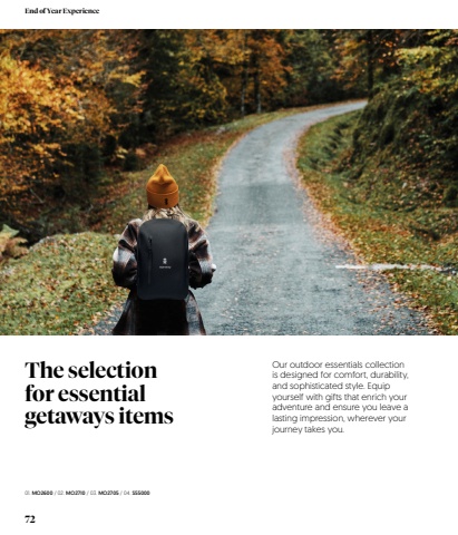 01. MO2600 / 02. MO2710 / 03. MO2705 / 04. S55000Our outdoor essentials collection is designed for comfort, durability, and sophisticated style. Equip yourself with gifts that enrich your adventure and ensure you leave a lasting impression, wherever your journey takes you.The selection for essential getaways items72End of Year Experience