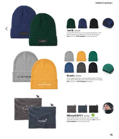 6007150408851560030304 03Blizzard RPET MO2350Fleece multiuse beanie, neckwarmer, polar fleece 200 gsm (100% RPET polyester). One-size-fits-all design. Size 25x23 cm Print technique Screen printing,T1,TD,TR,EBeanix MO2705Unisex knitted beanie hat in soft stretchable polyester (64%) and acrylic (36%) with rolled up cuff. A stretchy one-size-fits-all design. Size 20,5x21,5 cm Print technique EmbroideryAnvik MO2700Unisex knitted beanie hat in acrylic outside and polyester inside with 3M insulation and rolled up cuff. One-size-fits-all design. Size 19,5x23 cm Print technique Screen printing,T1,TD,E75Outdoor Experience