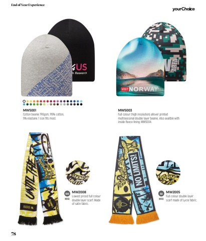 100MOQ50MOQMW2008Lowest priced full colour double layer scarf. Made of satin fabric. MW2005Full colour double layer scarf made of Lycra fabric. MW5003Full colour (high resolution) allover printed multiseasonal double layer beanie. Also availble with inside fleece lining: MW5004.MW5001Cotton beanie 190gsm, 95% cotton, 5% elastane. 1 size fits most.78End of Year Experience