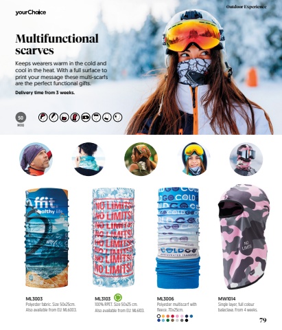 50MOQKeeps wearers warm in the cold and cool in the heat. With a full surface to print your message these multi-scarfs are the perfect functional gifts. Delivery time from 3 weeks.Multifunctional scarvesML3003Polyester fabric. Size 50x25cm. Also available from EU: ML6003. ML3103100% RPET. Size 50x25 cm.Also available from EU: ML6103. ML3006Polyester multiscarf with fleece. 70x25cm. MW1014 Single layer, full colour balaclava. From 4 weeks. 79Outdoor Experience