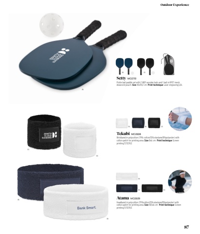85850306060606858585030303Setty MO2701Pickle ball paddle set with 2 MDF wooden bats and 1 ball in RPET mesh drawcord pouch. Size 40x19,2 cm Print technique Laser engraving,S,DLTekubi MO2608Wristband in polycotton (79% cotton/13% elastane/8%polyester) with cotton patch for printing area. Size 8x6 cm Print technique Screen printing,T1,TD,TR,EAtama MO2609Headband in polycotton (79%cotton/13% elastane/8%polyester) with cotton patch for printing area. Size 18,5x6 cm Print technique Screen printing,T1,TD,TR,E87Outdoor Experience