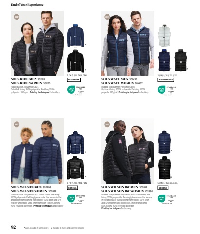 S / M / L / XL / XXL / 3XLS / M / L / XL / XXL / 3XL380T380T380T380TS / M / L / XL / XXL / 3XLS / M / L / XL / XXL / 3XLBKFNMGNY BKNYBKBEST SELLERSORONA SORONABODYWARMERBKFNSOL%u2019S WILSON MEN S02898SOL%u2019S WILSON WOMEN S02899Padded jacket. Polyamide 380T. Outer fabric and lining: 100% polyamide. Padding (please note that we are in the process of transitioning from stock): 90% down and 10% feather until stock lasts. Then transition to 60% Sorona 40% recycled polyester. Printing techniques EmbroiderySOL%u2019S RIDE MEN S01193SOL%u2019S RIDE WOMEN S01170Padded jacket. Polyamide 380T. Outside & lining: 100% polyamide. Padding: 100% polyester - 180 gsm. Printing techniques EmbroiderySOL%u2019S WAVE MEN S01436SOL%u2019S WAVE WOMEN S01437Padded bodywarmer. Polyamide 380T. Outside & lining: 100% polyamide. Padding: 100% polyester 180g/m%u00b2 Printing techniques EmbroiderySOL%u2019S WILSON BW MEN S02889SOL%u2019S WILSON BW WOMEN S02890Padded bodywarmer. Polyamide 380T. Outer fabric and lining: 100% polyamide. Padding (please note that we are in the process of transitioning from stock): 90% down and 10% feather until stock lasts. Then transition to 60% Sorona 40% recycled polyester. Printing techniques Embroidery 92 *Sizes available in some colors Available in men%u2019s and women%u2019s versionsEnd of Year Experience