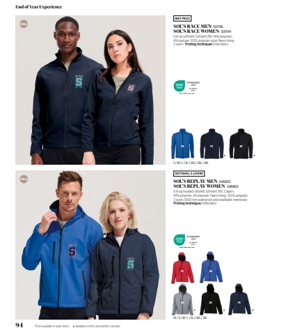 280 gr340 grXS / S / M / L / XL / XXL / 3XLS / M / L / XL / XXL / 3XL / 4XL RB FN BKRBBK FNPEGMBEST PRICESOFTSHELL 3 LAYERSSOL%u2019S RACE MEN S01195SOL%u2019S RACE WOMEN S01194Full-zip softshell. Softshell 280. 96% polyester, 4% elastane. 100% polyester polar fleece lining. 2 layers Printing techniques EmbroiderySOL%u2019S REPLAY MEN S46602SOL%u2019S REPLAY WOMEN S46802Full-zip hooded softshell. Softshell 340. 3 layers. 94% polyester, 6% elastane. Fleece lining : 100% polyester. 3 layers. 8000 mm waterproof and breathable membrane Printing techniques Embroidery94 *Sizes available in some colors Available in men%u2019s and women%u2019s versionsEnd of Year Experience