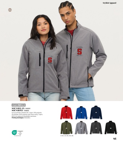 340 grS / M / L / XL / XXL / 3XL / 4XL PE RB ABAR GM CR BKSOFTSHELL 3 LAYERSSOL%u2019S RELAX S46600SOL%u2019S ROXY S46800Full-zip softshell. Softshell 340. 3 layers. 94% polyester,6% elastane. 100% polyester polar fleece lining. 3 layers. 8000 mm waterproof breathable membrane Printing techniques Embroidery95Stylish Apparel