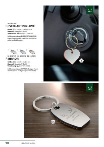 NEWNEWABENTEUER WARTEN56-0407017MIRRORGr%u00f6%u00dfe:%u00a0%u00d83,5 cm / 5 x 3 x 0,4 cmMaterial: Kunststoff / StahlVeredelung: %u00a05cm%u00b2 LY5+H2(1)Schl%u00fcsselanh%u00e4nger MIRROR: farbiger Kunststoff zwischen hochglanzpoliertem Stahl56-0407000EVERLASTING LOVEGr%u00f6%u00dfe:%u00a0%u00d83,5 cm / 4,3 x 3,5 x 0,4 cmMaterial: Kunststoff / StahlVeredelung: %u00a025x10mm LY5+H2(1)Schl%u00fcsselanh%u00e4nger EVERLASTING LOVE: rotes Kunststoffherz zwischen hochglanzpolierten Stahlherzen56-0407018 56-04070191001212
