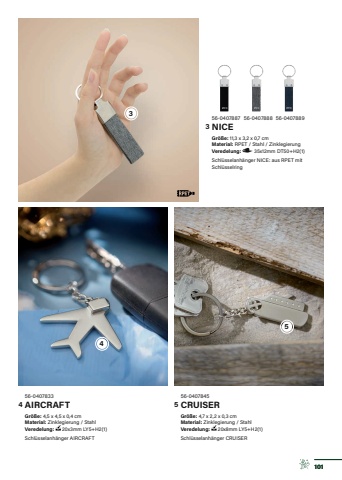 56-0407845CRUISERGr%u00f6%u00dfe:%u00a04,7 x 2,2 x 0,3 cmMaterial: Zinklegierung / StahlVeredelung: %u00a020x8mm LY5+H2(1)Schl%u00fcsselanh%u00e4nger CRUISER56-0407833AIRCRAFTGr%u00f6%u00dfe:%u00a04,5 x 4,5 x 0,4 cmMaterial: Zinklegierung / StahlVeredelung: %u00a020x3mm LY5+H2(1)Schl%u00fcsselanh%u00e4nger AIRCRAFT56-0407887 56-0407888 56-0407889NICEGr%u00f6%u00dfe:%u00a011,3 x 3,2 x 0,7 cmMaterial: RPET / Stahl / ZinklegierungVeredelung: %u00a035x12mm DT50+H2(1)Schl%u00fcsselanh%u00e4nger NICE: aus RPET mit Schl%u00fcsselring10134 5345