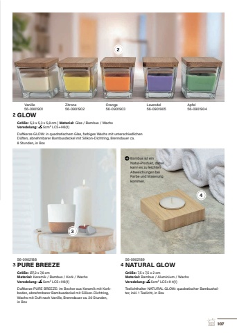 56-0901901GLOWGr%u00f6%u00dfe:%u00a05,3 x 5,3 x 5,8 cm | Material: Glas / Bambus / Wachs Veredelung: %u00a05cm%u00b2 LC5+H6(1)Duftkerze GLOW: in quadratischem Glas, farbiges Wachs mit unterschiedlichen D%u00fcften, abnehmbarer Bambusdeckel mit Silikon-Dichtring, Brenndauer ca. 8 Stunden, in Box56-0902188PURE BREEZEGr%u00f6%u00dfe:%u00a0%u00d87,2 x 7,6 cm Material: Keramik / Bambus / Kork / WachsVeredelung: %u00a05cm%u00b2 LC5+H6(1)Duftkerze PURE BREEZE: im Becher aus Keramik mit Korkboden, abnehmbarer Bambusdeckel mit Silikon-Dichtring, Wachs mit Duft nach Vanille, Brenndauer ca. 20 Stunden, in Box56-0901904Apfel56-0901905Lavendel56-0901902Zitrone56-0901903Vanille Orange56-0902189NATURAL GLOWGr%u00f6%u00dfe:%u00a07,5 x 7,5 x 2 cm Material: Bambus / Aluminium / WachsVeredelung: %u00a05cm%u00b2 LC5+H4(1)Teelichthalter NATURAL GLOW: quadratischer Bambushalter, inkl. 1 Teelicht, in BoxBambus ist ein Natur-Produkt, daher kann es zu leichten Abweichungen bei Farbe und Maserung kommen.10723 4234