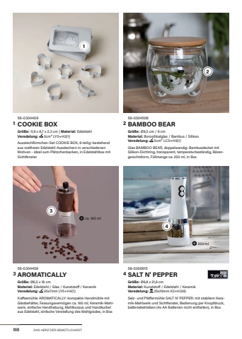DAS HERZ DER GEM%u00dcTLICHKEIT56-0304508BAMBOO BEARGr%u00f6%u00dfe:%u00a0%u00d89,3 cm / 9 cm Material: Borosilikatglas / Bambus / SilikonVeredelung: %u00a05cm%u00b2 LC5+H6(1)Glas BAMBOO BEAR, doppelwandig: Bambusdeckel mit Silikon-Dichtring, transparent, temperaturbest%u00e4ndig, B%u00e4rengesichtsform, F%u00fcllmenge ca. 250 ml, in Box56-0304409COOKIE BOXGr%u00f6%u00dfe:%u00a011,6 x 8,7 x 2,3 cm | Material: EdelstahlVeredelung: %u00a05cm%u00b2 LY5+H2(1)Ausstechf%u00f6rmchen-Set COOKIE BOX, 6-teilig: bestehend aus rostfreien Edelstahl-Ausstechern in verschiedenen Motiven - ideal zum Pl%u00e4tzchenbacken, in Edelstahlbox mit Sichtfenster58-0300615SALT N' PEPPERGr%u00f6%u00dfe:%u00a0%u00d86,8 x 21,6 cmMaterial: Kunststoff / Edelstahl / KeramikVeredelung: %u00a025x10mm K2+H3(4)Salz- und Pfefferm%u00fchle SALT N' PEPPER: mit stabilem Keramik-Mahlwerk und Sichtfenster, Bedienung per Knopfdruck, batteriebetrieben (4x AA Batterien nicht enthalten), in Box56-0304459AROMATICALLYGr%u00f6%u00dfe:%u00a0%u00d86,5 x 16 cmMaterial: Edelstahl / Glas / Kunststoff / KeramikVeredelung: %u00a020x7mm LY5+H4(1)Kaffeem%u00fchle AROMATICALLY: kompakte Handm%u00fchle mit Glasbeh%u00e4lter, Fassungsverm%u00f6gen ca. 160 ml, Keramik-Mahlwerk, einfache Handhabung, Mahlkorpus und Handkurbel aus Edelstahl, einfache Verstellung des Mahlgrades, in Boxca. 160 ml250 ml1101 23 41234