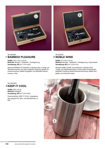 DAS HERZ DER GEM%u00dcTLICHKEIT56-0304453KEEP IT COOLGr%u00f6%u00dfe:%u00a0%u00d812 x 19 cmMaterial: EdelstahlVeredelung: %u00a05cm%u00b2 LY5+H4(1)Flaschenk%u00fchler KEEP IT COOL: doppelwandig, geeignet f%u00fcr Sekt- und Weinflaschen, in Box56-0301151NOBLE WINEGr%u00f6%u00dfe:%u00a027 x 21,5 x 7,5 cmMaterial: Bambus / Edelstahl / Zinklegierung / KarbonstahlVeredelung: %u00a05cm%u00b2 LC5+H7(1)Weinset NOBLE WINE, Sommelierset in Bambus-Box, 7-teilig: mit Hebelkorkenzieher, Karbonstahl-Ersatzspindel, Edelstahl-Tropfring, Metall-Flaschenverschluss, Metall-Ausgie%u00dfer und Folienschneider56-0301150BAMBOO PLEASUREGr%u00f6%u00dfe:%u00a022,5 x 12,5 x 4,5 cmMaterial: Bambus / Edelstahl / ZinklegierungVeredelung: %u00a05cm%u00b2 LC5+H4(1)Weinset BAMBOO PLEASURE, in Bambus-Box, 6-teilig: mit Weinthermometer aus Glas, Edelstahl-Tropfring, Metall-Flaschenverschluss, Metall-Ausgie%u00dfer und Edelstahl-Kellnermesser, in Box1141 231 23