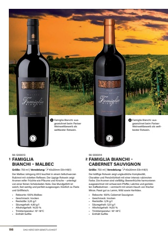 DAS HERZ DER GEM%u00dcTLICHKEIT56-1200013FAMIGLIA BIANCHI %u2013 MALBECGr%u00f6%u00dfe:%u00a0750 ml | Veredelung: %u00a040x20mm E8+H8(1)Der Malbec Jahrgang 2013 leuchtet in einem tiefschwarzen Rubinrot mit violetten Reflexen. Der %u00fcppige Rotwein zeigt Aromen reifer Fr%u00fcchte wie Pflaume und Kirsche %u2013 unterlegt von einer feinen Schokoladen-Note. Das Mundgef%u00fchl ist weich, fast samtig und perfekt ausgewogen. K%u00f6stlich zu Pasta und Grillfleisch. %u2022 Rebsorte: 100% Malbec %u2022 Geschmack: trocken %u2022 Rests%u00fc%u00dfe: 3,25 g/l %u2022 S%u00e4uregehalt: 4,80 g/l %u2022 Alkoholgehalt: 14,50 % %u2022 Trinktemperatur: 15%u00b0-18%u00b0C%u2022 Enth%u00e4lt Sulfite56-1200014FAMIGLIA BIANCHI - CABERNET SAUVIGNONGr%u00f6%u00dfe:%u00a0750 ml | Veredelung: %u00a040x20mm E8+H8(1)Der kr%u00e4ftige Rotwein zeigt unglaubliche Komplexit%u00e4t, Charakter und Pers%u00f6nlichkeit mit einer intensiv rubinroten Farbe. Die Aromen sind vielf%u00e4ltig: Beerenfr%u00fcchte harmonieren ausgezeichnet mit schwarzem Pfeffer, Lakritze und ger%u00f6steten Kaffeebohnen %u2013 vermischt mit einem Hauch von frischer Minze. Passt gut zu Lamm, Wild sowie Hartk%u00e4se. %u2022 Rebsorte: 100% Cabernet Sauvignon %u2022 Geschmack: trocken %u2022 Rests%u00fc%u00dfe: 3,76 g/l %u2022 S%u00e4uregehalt: 5,51 g/l %u2022 Alkoholgehalt: 14,50 % %u2022 Trinktemperatur: 16%u00b0-18%u00b0C%u2022 Enth%u00e4lt SulfiteFamiglia Bianchi: ausgezeichnet beim Pariser Weinwettbewerb als weltbester Rotwein.Famiglia Bianchi: ausgezeichnet beim Pariser Weinwettbewerb als weltbester Rotwein.1161 21 2