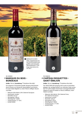 56-1205001MARQUIS DU BOIS - BORDEAUXGr%u00f6%u00dfe:%u00a0750 ml | Veredelung: %u00a040x20mm E8+H8(1)Der elegante im Eichenfass gereifte Jahrgang 2016 besticht durch Aromen von Schwarzer Johannisbeere und Kirsche. Er ist der ideale Begleiter zu rotem Fleisch, kr%u00e4ftigen Saucen und K%u00e4se.%u2022 Rebsorte: 80% Merlot, 20% Cabernet Sauvignon %u2022 Geschmack: trocken %u2022 Rests%u00fc%u00dfe: 0,13 g/l %u2022 S%u00e4uregehalt: 3,48 g/l %u2022 Alkoholgehalt: 14,00% %u2022 Trinktemperatur: 17%u00b0-18%u00b0C%u2022 Enth%u00e4lt Sulfite56-1205002CH%u00c2TEAU ROQUETTES - SAINT-%u00c9MILIONGr%u00f6%u00dfe:%u00a0750 ml | Veredelung: %u00a040x20mm E8+H8(1)Der SAINT-%u00c9MILION Jahrgang 2013 wurde im Eichenfass gelagert. Der samtige Rotwein von rubinroter Farbe verzaubert mit vollmundigem Geschmack und langanhaltendem Abgang. Er passt am besten zu Wurst, Grillfleisch, rotem Fleisch und K%u00e4se. %u2022 Rebsorte: 80% Merlot, 15% Cabernet Franc, 5%%u00a0Cabernet Sauvignon %u2022 Geschmack: trocken %u2022 Rests%u00fc%u00dfe: 0,09 g/l %u2022 S%u00e4uregehalt: 3,6 g/l %u2022 Alkoholgehalt: 13,00% %u2022 Trinktemperatur: 17%u00b0-18%u00b0C %u2022 Enth%u00e4lt SulfiteMARQUIS DU BOIS 2016: ausgezeichnet mit der Bronzemedaille beim gr%u00f6%u00dften internationalen Weinwettbewerb \lenge International du Vin 2017\1173 43 4