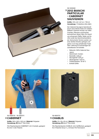56-12000822012 BIANCHI PARTICULAR - CABERNET SAUVIGNONGr%u00f6%u00dfe:%u00a037,5 x 9,7 x 9,7 cm / 750 ml Veredelung: %u00a040x20mm E8+H8(1)Der Cabernet Sauvignon beeindruckt durch seine tiefrote Farbe mit violetten Reflexen. Intensive Aromen von reifen Fr%u00fcchten, Pflaumen und Kirschen kennzeichnen diesen Wein. Ein Hauch von schwarzem Pfeffer, Tabak und Vanille rundet das Geschmackserlebnis ab. Harmonische Tannine werden von einer dichten Struktur getragen und gehen in ein lang anhaltendes Finale %u00fcber. Lieferung im hochwertigen Geschenkkarton mit Schleife.%u2022 Rebsorte: 100% Cabernet Sauvignon %u2022 Geschmack: trocken %u2022 Rests%u00fc%u00dfe: 3,86 g/l %u2022 S%u00e4uregehalt: 5,94 g/l %u2022 Alkoholgehalt: 14,50 % %u2022 Trinktemperatur: 16-18 %u00b0C%u2022 Enth%u00e4lt Sulfite56-0820712CHABLISGr%u00f6%u00dfe:%u00a023 x 10 x 40 cm | Material: PolyesterVeredelung: 50cm%u00b2 T50+H2(4)Filz-Flaschentasche CHABLIS: mit 2 Griffl%u00f6chern, geeignet f%u00fcr 2 Flaschen bis je 1 L, mit loser Filz-Trennwand56-0820710CABERNETGr%u00f6%u00dfe:%u00a029,5 x 10,5 x 10,5 cm | Material: PolyesterVeredelung: %u00a050cm%u00b2 T50+H1(4)Filz-Flaschentasche CABERNET: mit 2 Henkeln, geeignet f%u00fcr eine 1-Liter-Flasche56-082071111934534 5