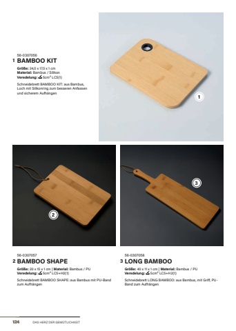 DAS HERZ DER GEM%u00dcTLICHKEIT56-0307056BAMBOO KITGr%u00f6%u00dfe:%u00a024,5 x 17,5 x 1 cmMaterial: Bambus / SilikonVeredelung: %u00a05cm%u00b2 LC5(1)Schneidebrett BAMBOO KIT: aus Bambus, Loch mit Silikonring zum besseren Anfassen und sicherem Aufh%u00e4ngen56-0307058LONG BAMBOOGr%u00f6%u00dfe:%u00a040 x 11 x 1 cm | Material: Bambus / PUVeredelung: %u00a05cm%u00b2 LC5+H2(1)Schneidebrett LONG BAMBOO: aus Bambus, mit Griff, PUBand zum Aufh%u00e4ngen56-0307057BAMBOO SHAPEGr%u00f6%u00dfe:%u00a020 x 15 x 1 cm | Material: Bambus / PUVeredelung: %u00a05cm%u00b2 LC5+H2(1)Schneidebrett BAMBOO SHAPE: aus Bambus mit PU-Band zum Aufh%u00e4ngen12412 3123