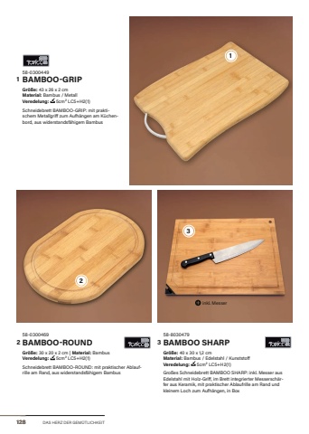 DAS HERZ DER GEM%u00dcTLICHKEIT58-0300449BAMBOO-GRIPGr%u00f6%u00dfe:%u00a043 x 26 x 2 cmMaterial: Bambus / MetallVeredelung: %u00a05cm%u00b2 LC5+H2(1)Schneidebrett BAMBOO-GRIP: mit praktischem Metallgriff zum Aufh%u00e4ngen am K%u00fcchenbord, aus widerstandsf%u00e4higem Bambus58-8030479BAMBOO SHARPGr%u00f6%u00dfe:%u00a040 x 30 x 1,2 cm Material: Bambus / Edelstahl / KunststoffVeredelung: %u00a05cm%u00b2 LC5+H2(1)Gro%u00dfes Schneidebrett BAMBOO SHARP: inkl. Messer aus Edelstahl mit Holz-Griff, im Brett integrierter Messersch%u00e4rfer aus Keramik, mit praktischer Ablaufrille am Rand und kleinem Loch zum Aufh%u00e4ngen, in Box58-0300469BAMBOO-ROUNDGr%u00f6%u00dfe:%u00a030 x 20 x 2 cm | Material: BambusVeredelung: %u00a05cm%u00b2 LC5+H2(1)Schneidebrett BAMBOO-ROUND: mit praktischer Ablaufrille am Rand, aus widerstandsf%u00e4higem Bambusinkl. Messer12812 3123