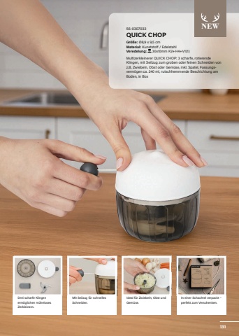 56-0307033 NEWQUICK CHOPGr%u00f6%u00dfe:%u00a0%u00d88,9 x 9,5 cmMaterial: Kunststoff / EdelstahlVeredelung: %u00a030x10mm K2+H4+V1(1)Multizerkleinerer QUICK CHOP: 3 scharfe, rotierende Klingen, mit Seilzug zum groben oder feinen Schneiden von z.B. Zwiebeln, Obst oder Gem%u00fcse, inkl. Spatel, Fassungsverm%u00f6gen ca. 240 ml, rutschhemmende Beschichtung am Boden, in BoxMit Seilzug f%u00fcr schnelles Schneiden.In einer Schachtel verpackt %u2013 perfekt zum Verschenken.Ideal f%u00fcr Zwiebeln, Obst und Gem%u00fcse.Drei scharfe Klingen erm%u00f6glichen m%u00fcheloses Zerkleinern.131