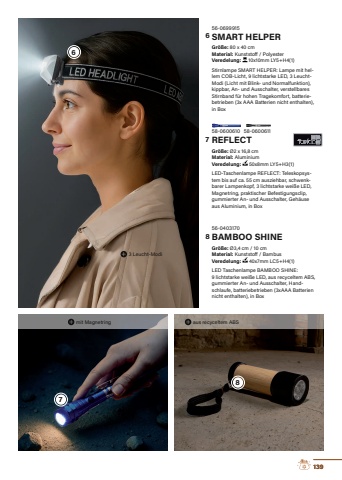 56-0403170BAMBOO SHINEGr%u00f6%u00dfe:%u00a0%u00d83,4 cm / 10 cmMaterial: Kunststoff / BambusVeredelung: %u00a040x7mm LC5+H4(1)LED Taschenlampe BAMBOO SHINE: 9 lichtstarke wei%u00dfe LED, aus recyceltem ABS, gummierter An- und Ausschalter, Handschlaufe, batteriebetrieben (3xAAA Batterien nicht enthalten), in Box56-0699915SMART HELPERGr%u00f6%u00dfe:%u00a080 x 40 cmMaterial: Kunststoff / PolyesterVeredelung: 10x10mm LY5+H4(1)Stirnlampe SMART HELPER: Lampe mit hellem COB-Licht, 9 lichtstarke LED, 3 LeuchtModi (Licht mit Blink- und Normalfunktion), kippbar, An- und Ausschalter, verstellbares Stirnband f%u00fcr hohen Tragekomfort, batteriebetrieben (3x AAA Batterien nicht enthalten), in Box58-0600610REFLECTGr%u00f6%u00dfe:%u00a0%u00d82 x 16,8 cmMaterial: AluminiumVeredelung: %u00a050x8mm LY5+H3(1)LED-Taschenlampe REFLECT: Teleskopsystem bis auf ca. 55 cm ausziehbar, schwenkbarer Lampenkopf, 3 lichtstarke wei%u00dfe LED, Magnetring, praktischer Befestigungsclip, gummierter An- und Ausschalter, Geh%u00e4use aus Aluminium, in Boxaus recyceltem ABS3 Leucht-Modimit Magnetring58-0600611139678678