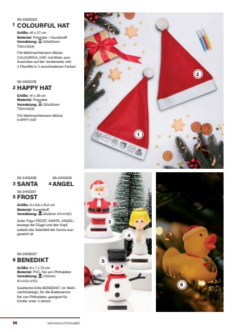 WEIHNACHTSZAUBER56-0410209ANGEL56-0410208SANTA56-0410207FROSTGr%u00f6%u00dfe:%u00a06 x 6,8 x 10,2 cmMaterial: KunststoffVeredelung: %u00a025x5mm K1+H4(1)Solar-Figur FROST, SANTA, ANGEL: bewegt die Fl%u00fcgel und den Kopf, sobald das Solarfeld der Sonne ausgesetzt ist56-0905025COLOURFUL HATGr%u00f6%u00dfe:%u00a042 x 27 cmMaterial: Polyester / KunststoffVeredelung: %u00a0100x50mm T50+H2(4)Filz-Weihnachtsmann-M%u00fctze COLOURFUL HAT: mit Motiv zum Ausmalen auf der Vorderseite, inkl. 3 Filzstifte in 3 verschiedenen Farben56-0902218HAPPY HATGr%u00f6%u00dfe:%u00a041 x 29 cmMaterial: PolyesterVeredelung: %u00a0120x30mm T50+H2(4)Filz-Weihnachtsmann-M%u00fctze HAPPY HAT56-0909027BENEDIKTGr%u00f6%u00dfe:%u00a08 x 7 x 7,5 cmMaterial: PVC, frei von PhthalatenVeredelung: %u00a017x5mm K1+H2+V1(1)Quietsche-Ente BENEDIKT: im Weihnachtsdesign, f%u00fcr die Badewanne: frei von Phthalaten, geeignet f%u00fcr Kinder unter 3 Jahren14235461123456