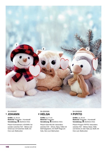 KLEINE SCH%u00c4TZE56-0502066HELGAGr%u00f6%u00dfe:%u00a0ca. 17 cmMaterial: PolyesterVeredelung: %u00a035x10mm K1(1)Pl%u00fcsch-Eule HELGA: besonders weiches Fell %u2013 Ohren, Nase, F%u00fc%u00dfe mit Stoff abgesetzt, mit Stoff-Fliege am Hals, Herz zum Bedrucken56-0502067JOHANNGr%u00f6%u00dfe:%u00a0ca. 19 cmMaterial: Polyester / KunststoffVeredelung: %u00a035x10mm K1(1)Pl%u00fcsch-Schneemann JOHANN: besonders weiches Fell %u2013 M%u00fctze und Schal aus rot-kariertem Stoff, mit Herz zum Bedrucken56-0502068PIPITOGr%u00f6%u00dfe:%u00a0ca. 19 cmMaterial: Polyester / KunststoffVeredelung: %u00a035x10mm K1(1)Pl%u00fcsch-Pinguin PIPITO: besonders weiches Fell %u2013 M%u00fctze, Nase, F%u00fc%u00dfe und Schal um den Hals aus Stoff, mit Herz zum Bedrucken1481 2 312 3