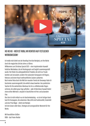 HO HO HO - HIER IST RION, IHR RENTIER AUF FESTLICHER WERBEMISSION!Ich melde mich direkt von der Branding-Front des Nordpols, um Ihre Marke durch die magischste Zeit des Jahres zu f%u00fchren.Willkommen zum Christmas Special 2025 %u2013 einer inspirierenden Auswahl festlicher Werbeideen, die mit Rentiergesp%u00fcr und Sorgfalt zusammengestellt wurde. Hier finden Sie au%u00dfergew%u00f6hnliche Produkte, die nicht nur Freude bereiten und verzaubern, sondern Ihre saisonalen Kampagnen mit Eleganz, Relevanz und einem Hauch weihnachtlichen Zaubers aufwerten.Nach meiner Reise durch die Welt der neuesten Trends der Giveaways habe ich Geschenke zusammengestellt, die wirklich etwas bewirken. Von praktischen Taschen f%u00fcr Ihre winterlichen Abenteuer bis hin zu reflektierenden Regenschirmen, die selbst graue Tage aufhellen %u2013 jeder Artikel dieser Auswahl bietet einen echten Mehrwert, verpackt in Geschichten mit Herz und saisonalem Flair.Dies hier ist nicht einfach nur ein Geschenkekatalog %u2013 es ist ein fertiges Handbuch f%u00fcr Kampagnen, die ankommen. Was z%u00e4hlt sind Funktionalit%u00e4t, Kreativit%u00e4t und eine Prise Magie %u2013 direkt vom Nordpol.Auf eine Saison voller Glanz, Strategie und unvergesslicher Momente f%u00fcr Ihre Marke.Mit freundlichen Gr%u00fc%u00dfenRION %u2013 das Promo-Rentier 2