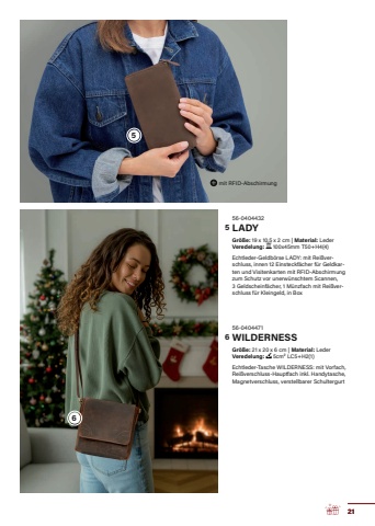 56-0404432LADYGr%u00f6%u00dfe:%u00a019 x 10,5 x 2 cm | Material: LederVeredelung: %u00a0100x45mm T50+H4(4)Echtleder-Geldb%u00f6rse LADY: mit Rei%u00dfverschluss, innen 12 Einsteckf%u00e4cher f%u00fcr Geldkarten und Visitenkarten mit RFID-Abschirmung zum Schutz vor unerw%u00fcnschtem Scannen, 3 Geldscheinf%u00e4cher, 1 M%u00fcnzfach mit Rei%u00dfverschluss f%u00fcr Kleingeld, in Boxmit RFID-Abschirmung56-0404471WILDERNESSGr%u00f6%u00dfe:%u00a021 x 20 x 6 cm | Material: LederVeredelung: %u00a05cm%u00b2 LC5+H2(1)Echtleder-Tasche WILDERNESS: mit Vorfach, Rei%u00dfverschluss-Hauptfach inkl. Handytasche, Magnetverschluss, verstellbarer Schultergurt215656