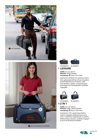56-0808570LEISUREGr%u00f6%u00dfe:%u00a054 x 31 x 26 cmMaterial: 300D PolyesterVeredelung: %u00a050cm%u00b2 T50+H6(4)Sporttasche LEISURE, mit seitlichem Schuhfach: ger%u00e4umiges Rei%u00dfverschluss-Hauptfach, gro%u00dfe Rei%u00dfverschluss-Vortasche, seitliches Netzfach, verstell- und abnehmbarer Schultergurt mit Schulterpolster, verst%u00e4rkte Tragegriffe56-0808571mit Schuhfach56-08085722 IN 1Gr%u00f6%u00dfe:%u00a055 x 30 x 28 cmMaterial: 300D / 600D PolyesterVeredelung: %u00a050cm%u00b2 T50+H2(4)Sporttasche 2 IN 1: ger%u00e4umiges Rei%u00dfverschluss-Hauptfach, Rei%u00dfverschluss-Vortasche, 1 zus%u00e4tzliche Trageschlaufe, 2 seitliche Rei%u00dfverschluss-Taschen, verst%u00e4rkte Tragegriffe, auch als Rucksack einsetzbar56-0808573auch als Rucksack einsetzbar291212
