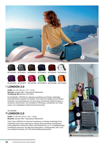 FANTASTISCHE WELT DES REISENS56-2202508LONDON 2.0Gr%u00f6%u00dfe:%u00a0ca. 46 x 40 x 20 cm / 30 L / 2,8 kg Material: robuster ABS / Polycarbonat-MaterialmixCabin Case LONDON 2.0: exklusive Ausstattung und Design, beidseitige Packm%u00f6glichkeit durch Kreuz-Spanngurte, separat herausnehmbare Innenf%u00e4chertasche, geeignet f%u00fcr Dokumente, Akten und Notebooks bis ca. 17%u2019%u2019 (modellabh%u00e4ngig), arretierbares Aluminium-Druckknopf-Trolleysystem, 4-Zwillingsrollen-360%u00b0-rundum-Leichtlauf-Fahrwerk, inkl. TSA-ZahlenkombinationsschlossLONDON 2.0Gr%u00f6%u00dfe:%u00a033 x 30 x 16,5 cm / 14 L / 1,2 kgMaterial: robuster ABS / Polycarbonat-MaterialmixVeredelung: %u00a020x10mm LY5+H12(1)Kosmetikkoffer LONDON 2.0: exklusive Ausstattung und Design, beidseitige Packm%u00f6glichkeit, Hauptfach mit flexibler Trennwand inkl. Spiegel, diverse flexible Schlaufen und Einstecktaschen mit Gummizug, entnehmbare Rei%u00dfverschluss-Innentasche, abnehmbarer und verstellbarer Schultergurt, aufsteckbar auf Trolleysystem, inkl. beigef%u00fcgtem ZahlenkombinationsschlossWerbeanbringung auf Anfrage56-2240576 56-2240578 56-2240580 56-224058156-224057256-224057756-224057356-224057956-2240570 56-2240571 56-2240574 56-2240575342112