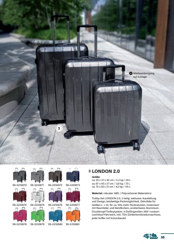 LONDON 2.0Gr%u00f6%u00dfe:ca. 55 x 37 x 20 cm / 2,3 kg / 29 L ca. 67 x 45 x 27 cm / 3,6 kg / 72 L ca. 75 x 52 x 31 cm / 4,3 kg / 110 L Material: robuster ABS / Polycarbonat-MaterialmixTrolley-Set LONDON 2.0, 3-teilig: exklusive Ausstattung und Design, beidseitige Packm%u00f6glichkeit, Dehnfalte f%u00fcr Gr%u00f6%u00dfen L + XL f%u00fcr ca. 10% mehr Packvolumen, Innenraum mit Raumteiler und Netzf%u00e4chern, arretierbares AluminiumDruckknopf-Trolleysystem, 4-Zwillingsrollen-360%u00b0-rundumLeichtlauf-Fahrwerk, inkl. TSA-Zahlenkombinationsschloss, jeder Koffer mit SchutzbeutelWerbeanbringung auf Anfrage56-2210680 56-221068156-221067656-221067256-221067756-221067356-221067956-221067556-221067156-221067456-221067856-22106703533