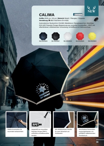 NEWCALIMAGr%u00f6%u00dfe:%u00a0%u00d8105 cm / 83 cm | Material: Metall / Fiberglas / PolyesterVeredelung: %u00a0280/170x210mm S1+H2(6)Automatischer Stockschirm CALIMA: Metallstock, Fiberglasspeichen, Metalltips, EVA-Griff, Polyester-Pongee-Bespannung aus recycelten Kunststoffen / RPET, mit silberfarbener, reflektierender Umrandung, Schlie%u00dfband mit KlettverschlussVerschiedene Personalisierungsm%u00f6glichkeiten, einschlie%u00dflich reflektierendem Transferdruck.Hergestellt aus recyceltem Polyester-Pongee (RPET), unterst%u00fctzt umweltbewusstes Handeln.Stabile Konstruktion f%u00fcr dauerhafte Verl%u00e4sslichkeit.Mit reflektierendem Streifen f%u00fcr mehr Sicherheit und Sichtbarkeit.56-0103520 56-0103521 56-0103522 56-0103523 56-010352439