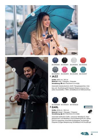 56-0104230EARLGr%u00f6%u00dfe:%u00a0%u00d8116 cm / 95,5 cmMaterial: Metall / Fiberglas / PolyesterVeredelung: %u00a0280/170x210mm S1+H4(6)Automatik-Golfschirm EARL: schwarzer Metallstock, Fiberglasspeichen und Metalltips, Holzrundhakengriff und -Spitze, Griff mit integrierter Automatik-Ausl%u00f6setaste, hochwertige Polyester-Pongee-Bespannung, Schlie%u00dfband mit Druckknopf56-0103514JAZZGr%u00f6%u00dfe:%u00a0%u00d8103 cm / 89 cmMaterial: Holz / Fiberglas / PolyesterVeredelung: 280/170x210mm S1+H2(6)Automatik-Holzstockschirm JAZZ: Fiberglasspeichen, Holztips und -Rundhakengriff, Polyester-Bespannung aus recycelten Kunststoffen / RPET, Schlie%u00dfband mit Klettverschluss56-0104231 56-010423256-0103516 56-010351756-0103512 56-010351356-010351556-0103510 56-0103511411212