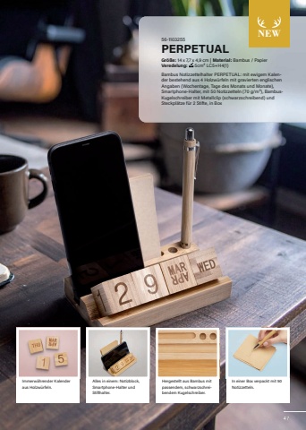 56-1103255NEWPERPETUALGr%u00f6%u00dfe:%u00a014 x 7,7 x 4,9 cm | Material: Bambus / PapierVeredelung: %u00a05cm%u00b2 LC5+H4(1)Bambus Notizzettelhalter PERPETUAL: mit ewigem Kalender bestehend aus 4 Holzw%u00fcrfeln mit gravierten englischen Angaben (Wochentage, Tage des Monats und Monate), Smartphone-Halter, mit 50 Notizzetteln (70 g/m%u00b2), BambusKugelschreiber mit Metallclip (schwarzschreibend) und Steckpl%u00e4tze f%u00fcr 2 Stifte, in BoxAlles in einem: Notizblock, Smartphone-Halter und Stifthalter.In einer Box verpackt mit 50 Notizzetteln.Immerw%u00e4hrender Kalender aus Holzw%u00fcrfeln.Hergestellt aus Bambus mit passendem, schwarzschreibendem Kugelschreiber.47