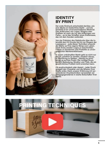 Alle im Katalog gezeigten M%u00f6glichkeiten der Veredelung sind echte Drucke bzw. Lasergravuren. Konnten wir Sie inspirieren? Pr%u00fcfen Sie mit unserem Vertriebsteam, welche Variante am besten zu Ihrem Logo passt!PRINTING TECHNIQUESIDENTITY BY PRINTDer erste Eindruck entscheidet dar%u00fcber, wie eine Marke im Ged%u00e4chtnis bleibt %u2013 und die Identit%u00e4t ist ihr unverwechselbares Merkmal. Das Aufdrucken von Logos, Slogans oder Grafiken ist mehr als nur das Aufbringen von Farbe %u2013 es ist das Schaffen eines Erlebnisses, das mit dem Kunden verbindet.Von der Pr%u00e4zision des Siebdrucks %u00fcber die In- tensit%u00e4t des UV-Drucks bis hin zur Eleganz der Lasergravur %u2013 jede dieser Techniken erweckt die Marke auf ihre eigene Weise zum Leben. Dank ihnen werden Logos zu Geschichten, Farben zu Emotionen und Produkte zu unver- gesslichen Markenerlebnissen.In einem umk%u00e4mpften Markt geht es nicht nur darum, gesehen zu werden, sondern darum, in Erinnerung zu bleiben. %u201eIdentity by print%u201c bringt es auf den Punkt: Der richtige Druck verleiht Bedeutung, Struktur und Tiefe, die ein gew%u00f6hnliches Produkt nicht erreichen kann.Ob ausdrucksstark oder dezent %u2013 jeder Druck spiegelt den Charakter und die Mission Ihrer Marke wider. Dank unserer Erfahrung mit ver- schiedenen Drucktechniken verwandeln wir Alltagsgegenst%u00e4nde in starke Botschafter Ihrer Marke.5