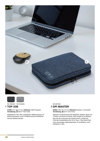 B%u00dcRO IN BESTFORM56-1107393DPI MASTERGr%u00f6%u00dfe:%u00a010,8 x 6 x 2,7 cm | Material: Bambus / KunststoffVeredelung: %u00a05cm%u00b2 LC5+H4(1)Optische Computermaus DPI MASTER, kabellos: Maus mit 3 Tasten und einem Scrollrad, USB-Dongle ist im Batteriefach auf der Unterseite des Ger%u00e4tes fixiert, Aufl%u00f6sung 1.200 dpi, Arbeitsdistanz bis 10 m, Plug + Play (keine Software notwendig), batteriebetrieben (1x AA Batterie nicht enthalten), in Box56-1103344TOP JOBGr%u00f6%u00dfe:%u00a023 x 16,5 x 5 cm | Material: 300D PolyesterVeredelung: %u00a050cm%u00b2 T50+H2(4)Kabeltasche TOP JOB: umlaufender Rei%u00dfverschluss, f%u00fcr Elektronikzubeh%u00f6r, innen 2 Rei%u00dfverschluss-Netzf%u00e4cher, diverse Elastikschlaufen56-1103345501 22 1