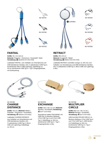 FANTAILGr%u00f6%u00dfe:%u00a018 x 1,5 x 0,6 cm Material: Polyester / Aluminium / Kunststoff / StahlVeredelung: %u00a020x10mm K1+H2+V1(4)Ladekabel FANTAIL: zum Aufladen von Smartphones und USB-betriebenen Ger%u00e4ten, inkl. 2 Ladesteckern (USB Typ C, Kombistecker Micro-USB/Lightning), Kabell%u00e4nge ca. 18 cm, kombinierter USB Typ A / Typ C Eingangsstecker, mit Schl%u00fcsselring56-1107101 56-110729156-1107102 56-110729256-1107103 56-1107293RETRACTGr%u00f6%u00dfe:%u00a0%u00d85 x 25 cm Material: Kunststoff / MetallVeredelung: %u00a0%u00d830mm K2+H2+V1(4)Ladekabel RETRACT, aufrollbar (L%u00e4nge: ca. 100 cm): zum Aufladen von Smartphones und USB-betriebenen Ger%u00e4ten, inkl. 3 Ladesteckern (USB Typ C, Micro-USB und Lightning), in Box56-1107381CHARGE DISTANCEGr%u00f6%u00dfe:%u00a0120 cm | Material: Metall / Polyester / Aluminium / Kunststoff | Veredelung: %u00a015x5mm LY5+H2(1)Ladekabel CHARGE DISTANCE: zum Aufladen von Smartphones und USB-betriebenen Ger%u00e4ten, inkl. 3 Ladesteckern (USB Typ C, MicroUSB und Lightning), Kabell%u00e4nge ca. 120 cm56-1107378EXCHANGEGr%u00f6%u00dfe:%u00a010,5 x 4,6 x 1,7 cm | Material:Bambus / Kunststoff | Veredelung:%u00a05cm%u00b2 LC5+H2(1)Smartphone-Halter EXCHANGE, mit USB Hub: im Bambus-Geh%u00e4use, 2 Port USB Typ A und 2 Port USB Typ C, Kabell%u00e4nge ca. 18,5 cm, kombinierter USB Typ A / Typ C Eingangsstecker, in Box56-1107106MULTIPLIER CIRCLEGr%u00f6%u00dfe:%u00a0%u00d85,7 cm / 28 x 1,2 cm | Material: Bambus / Kunststoff | Veredelung: 5cm%u00b2 LC5+H2(1)USB Hub MULTIPLIER CIRCLE: im Bambus-Geh%u00e4use, 2 Port USB Typ A und 1 Port USB Typ C, USB Version 2.0, Kabell%u00e4nge ca. 20,5 cm, kombinierter USB Typ A / Typ C Eingangsstecker, in Boxaufrollbar51