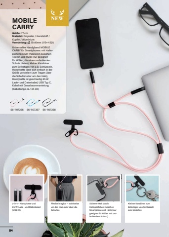 NEWFlexibel tragbar %u2013 wahlweise um den Hals oder %u00fcber die Schulter.Kleiner Karabiner zum Befestigen von Schl%u00fcsseln oder Zubeh%u00f6r.2-in-1 %u2013 Handykette und 65-W-Lade- und Datenkabel (USB-C).Sicherer Halt durch Haltepl%u00e4ttchen zwischen Smartphone und H%u00fclle (nur geeignet f%u00fcr H%u00fcllen mit umlaufendem Schutz).MOBILE CARRYGr%u00f6%u00dfe:%u00a077 cmMaterial: Polyester / Kunststoff / Kupfer / AluminiumVeredelung: %u00a025x10mm LY5+H2(1)Universelles Handyband MOBILE CARRY f%u00fcr Smartphones: mit Haltepl%u00e4ttchen zum Platzieren zwischen Telefon und H%u00fclle (nur geeignet f%u00fcr H%u00fcllen, die einen umlaufenden Schutz bieten), kleiner Karabiner zum Befestigen von z.B. Schl%u00fcsseln, Handykette l%u00e4sst sich einfach in der Gr%u00f6%u00dfe verstellen (zum Tragen %u00fcber die Schulter oder um den Hals), Handykette ist gleichzeitig 65 W Lade- und Datenkabel, USB Typ C, Kabel mit Gewebeummantelung (Kabell%u00e4nge ca. 144 cm)56-1107396 56-1107397 56-110739854